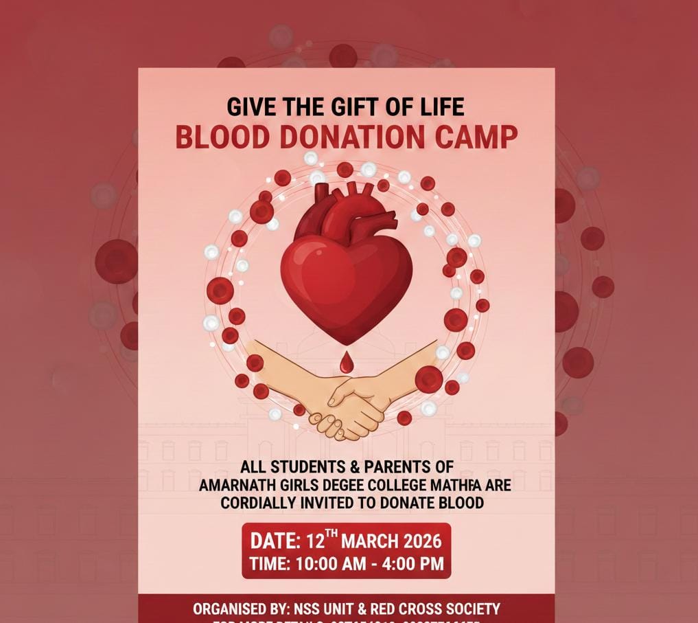 This is to inform all the students and faculty members that the NSS Unit of Amarnath Girls Degree College, Mathura in collaboration with Blood Bank, Mathura, is organizing a Blood Donation Camp. Donating blood is a noble cause that can save lives and contribute to our community's well-being. We encourage all healthy volunteers to come forward and participate in this life-saving initiative. Event Details: Date: March 12, 2026 Time: 10:00 AM to 2:00 PM Venue: Amarnath Girls Degree College, Mathura Eligibility: Volunteers should be above 18 years of age and weigh at least 45 kg. Note to Donors: Ensure you have a healthy meal before donating. All donors will receive a Certificate of Appreciation and light refreshments. Interested students are requested to register their names to their class teacher by March 8, 2026.